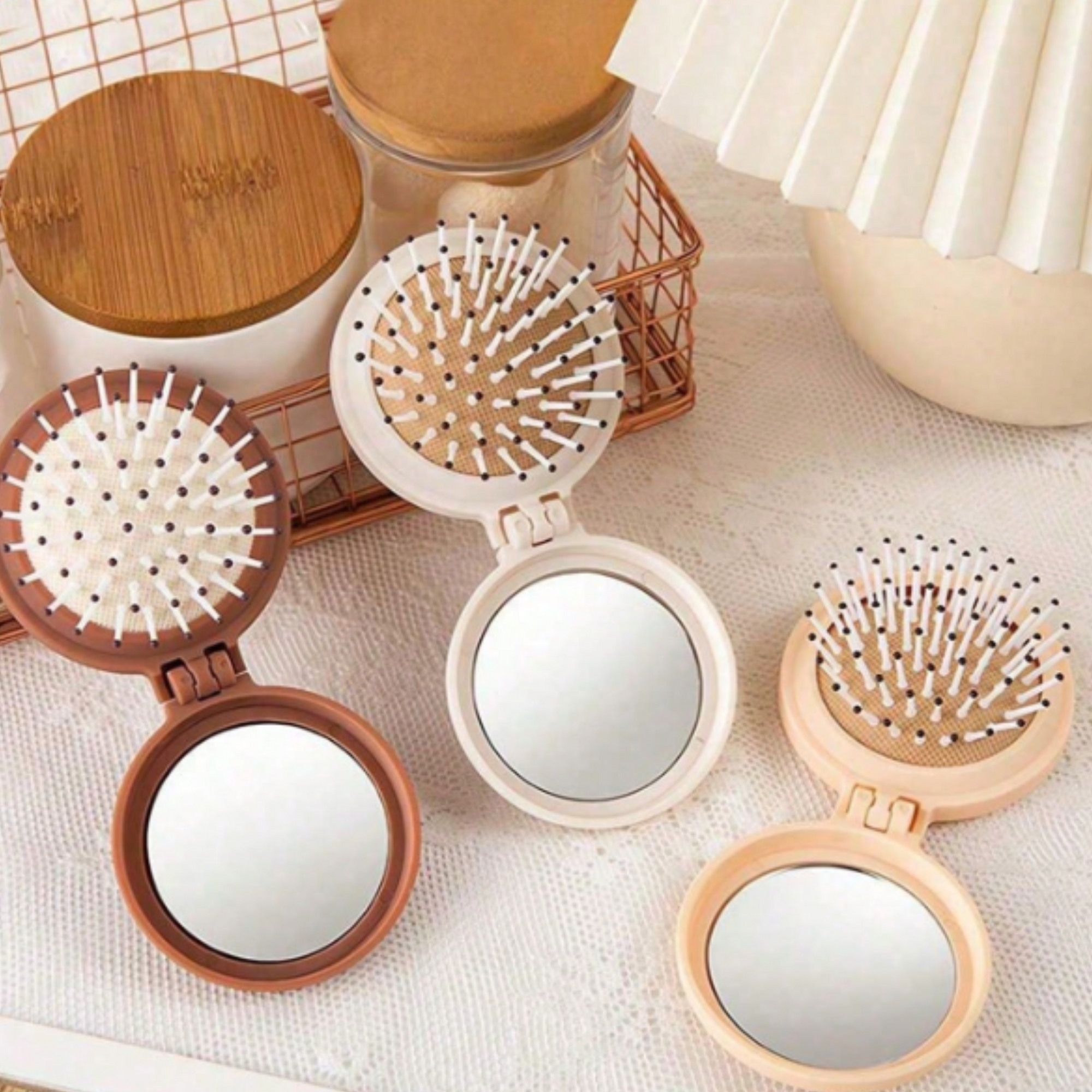 1pc Macaron-Style Cushion Hair Brush with Built-In Mirror (Beige)