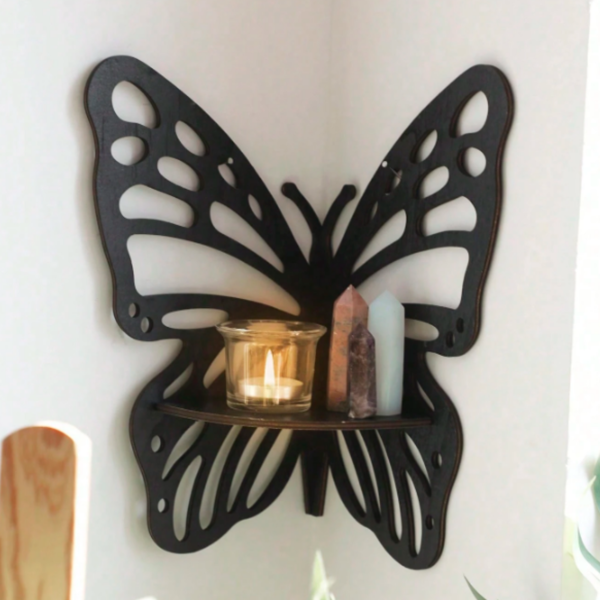 Butterfly-Shaped Wooden Corner Floating Shelf (Black) -